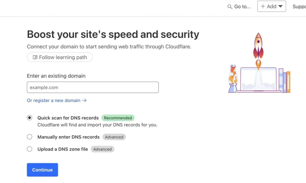 点击“Add”,填入自己的域名,然后点击“Continue”