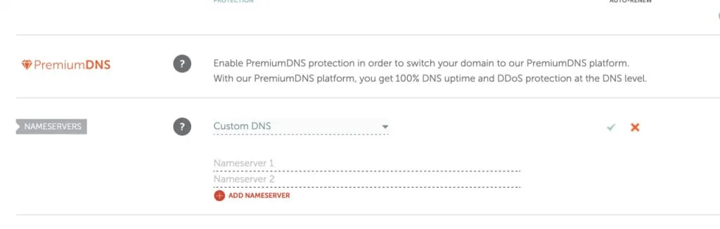进入域名配置的页面,在name server中选择custom DNS,将cloudflare提供的两个name server全部复制进去。点击确认。