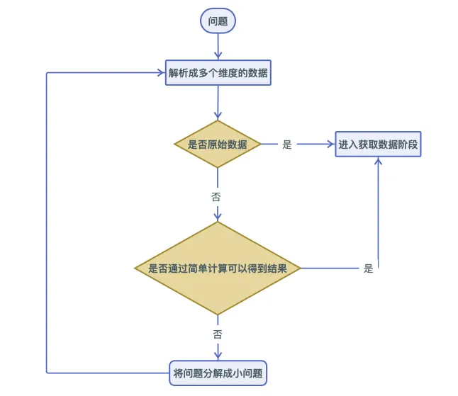 如果有些数据不能得到原始数据,可以判断一下,是否通过简单的计算可以得到结果。如果可以,那么,就可以进入埋点获取数据阶段了。如果简单的计算无法得到结果,那么,就需要将问题分解成一些简单的小问题。