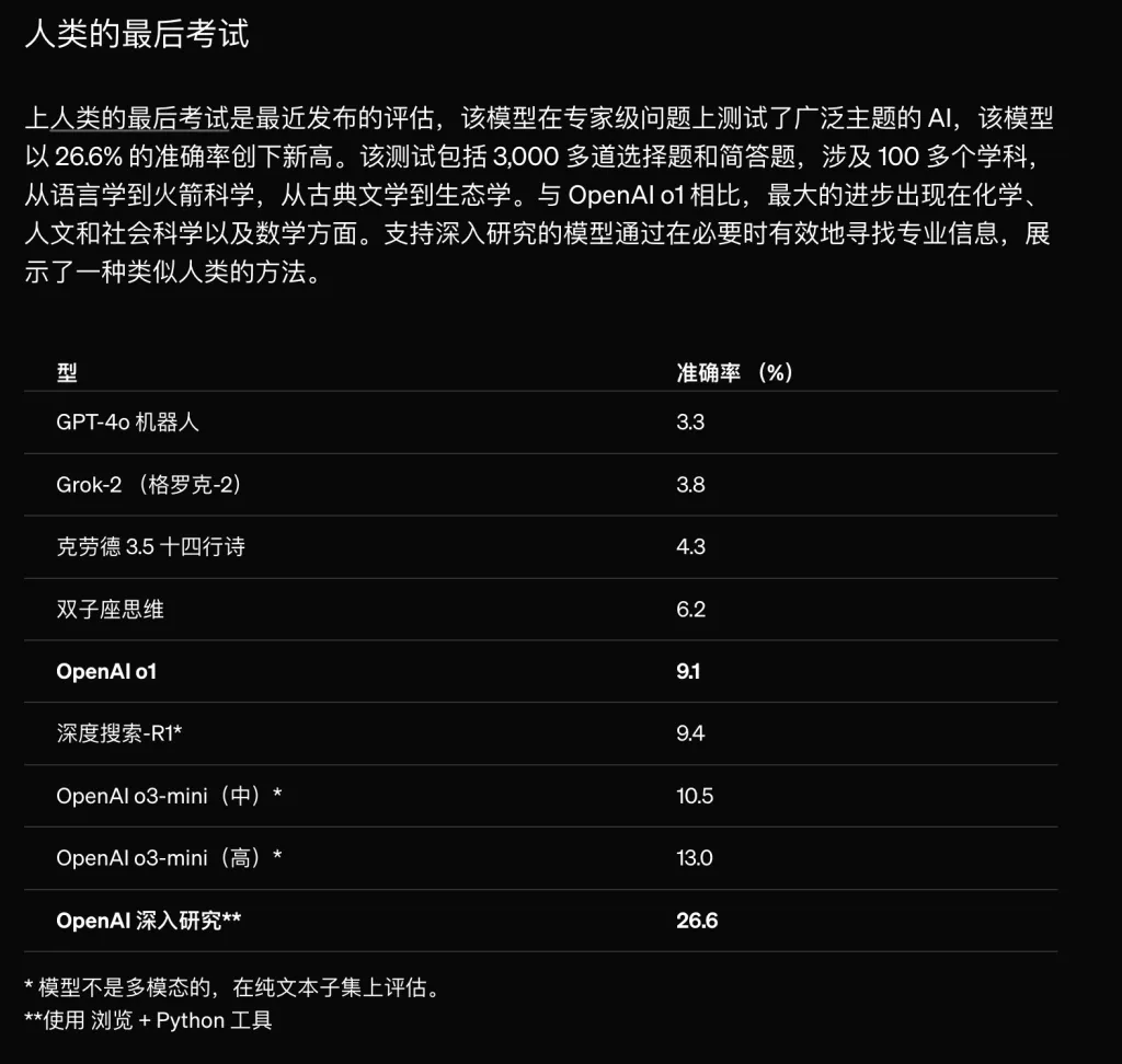 看看OpenAI网站上给的一个测试对比吧。翻译成了中文。最后一项是Deep Research。不做评价。