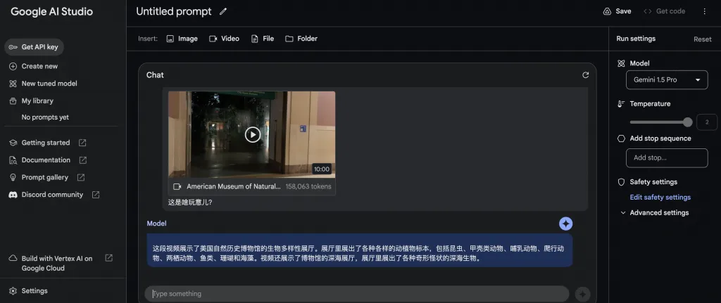 Gemini 1.5 pro 可以支持文字、图片、视频、文件、文件夹作为prompt输入。
