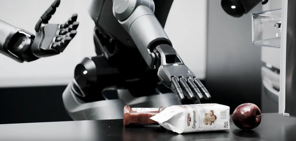 比如:机器人从未见过“塑料勺子”,当指令是“递给我餐具”时,Helix可以自动识别并抓取这个塑料勺子。