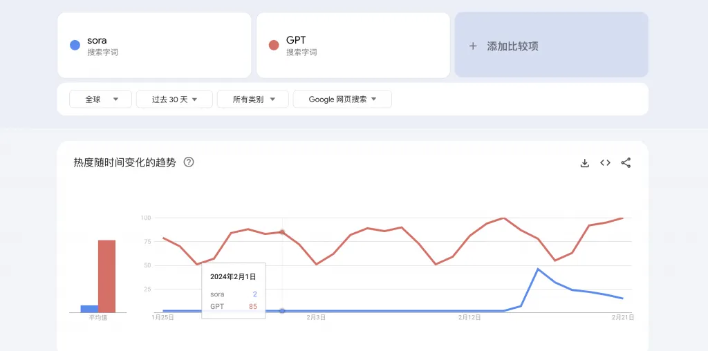 2024年02月16日,Open AI发布了视频生成大模型,随后,sora这个词在Google的搜索量开始快速上升,一度几乎赶上gpt的搜索量,不过最近几天下降了一些。