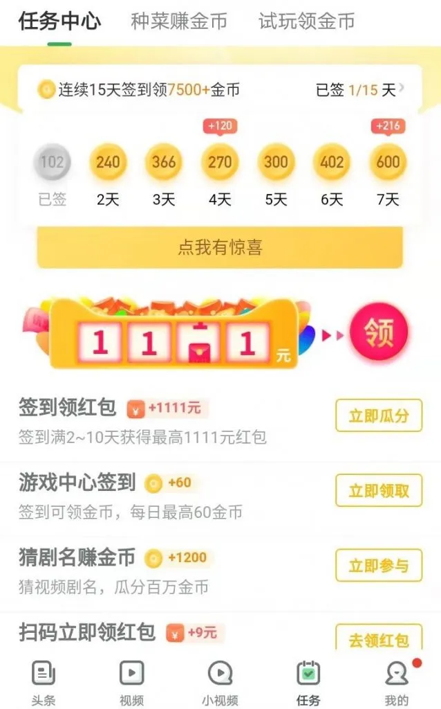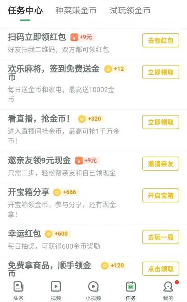 趣头条的积分体系引入了很多游戏化的东西,甚至也直接引入了游戏,一方面大大加强了用户获得积分的方法和渠道,另一方面,也大大提升了用户的参与程度、传播和留存。